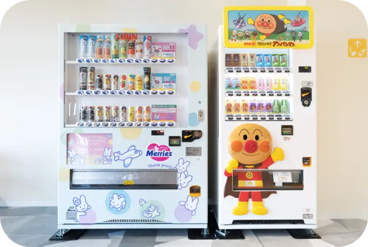 急な外出時にも安心。紙おむつやウェットティッシュを購入できる専用自動販売機を設置しております。子育て世代に優しい施設です。